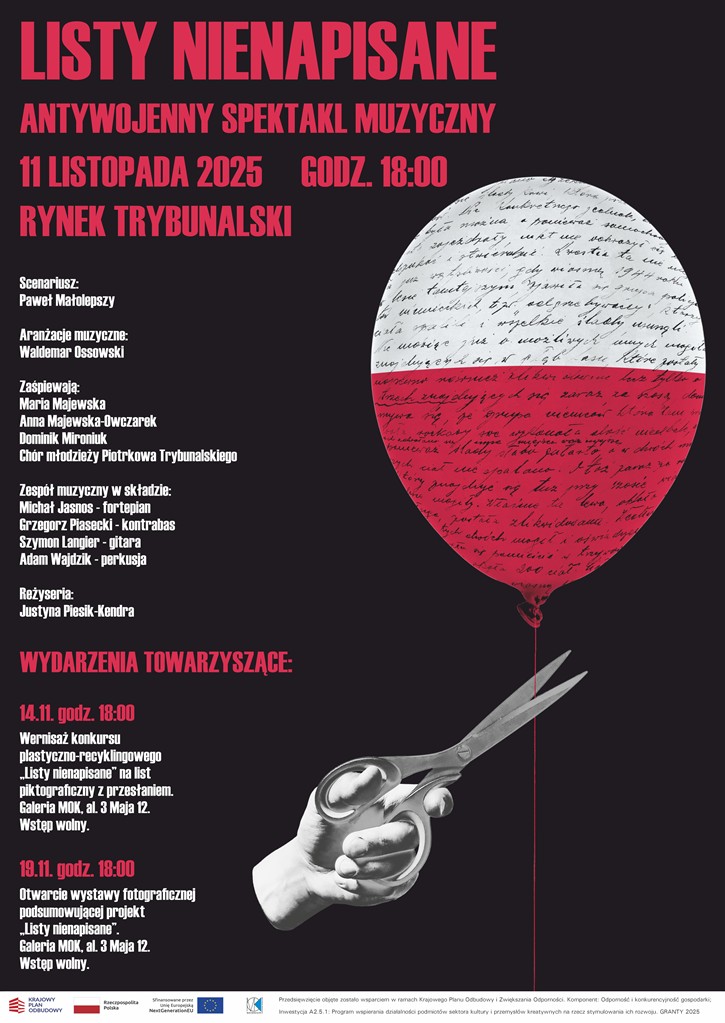 Miejski Ośrodek Kultury zaprasza na premierę antywojennego spektaklu muzycznego pt. „Listy Nienapisane"! To wyjątkowe wydarzenie, w którym muzyka staje się głosem sprzeciwu wobec wojny i nadziei na lepsze jutro. Pokaz spektaklu odbędzie się na finał obchodów Święta Niepodległości w Piotrkowie Trybunalskim.