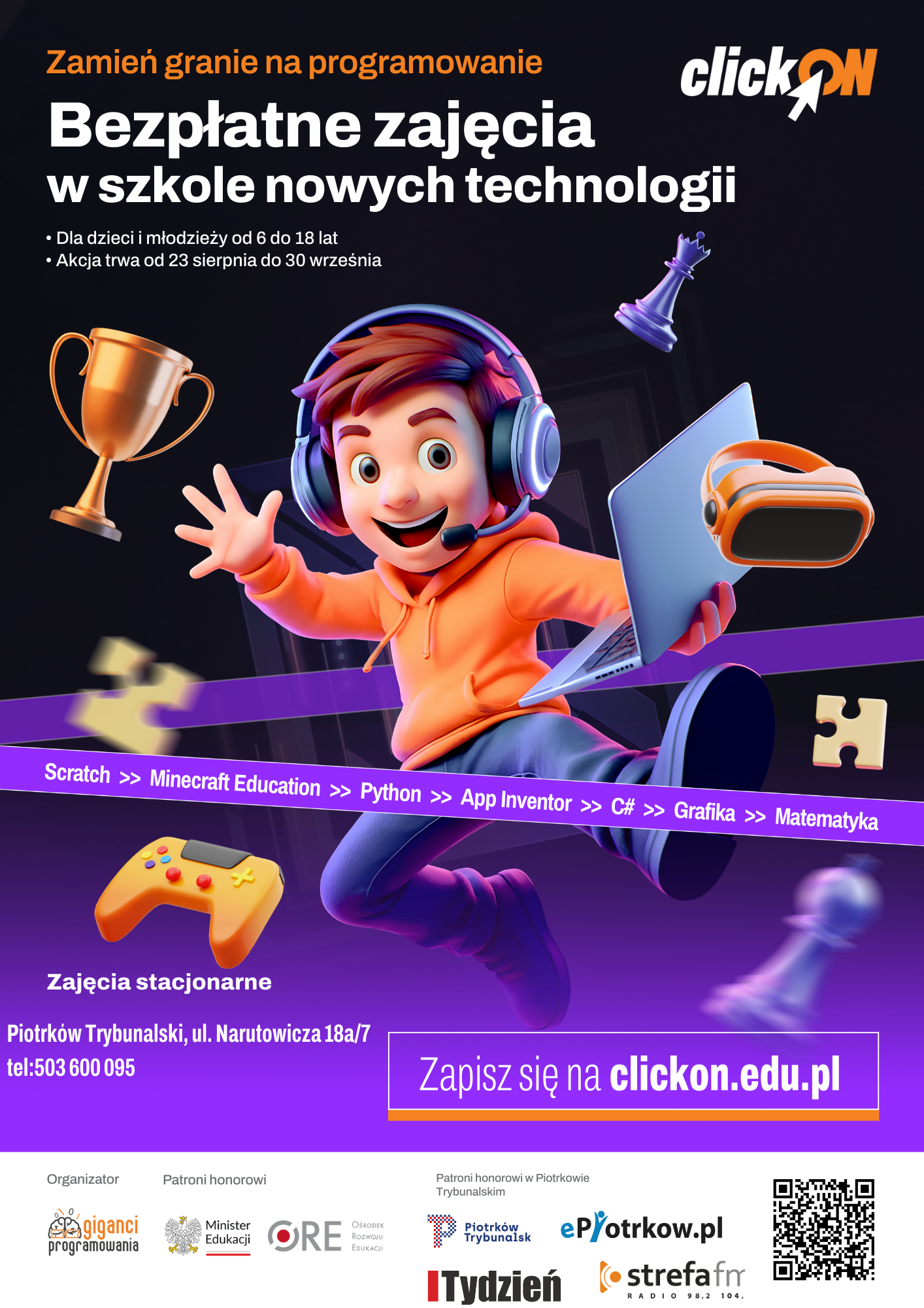 Giganci Programowania Piotrków Trybunalski zapraszają dzieci i młodzież na bezpłatne warsztaty programistyczne. Wydarzenie odbywa się pod Patronatem Honorowym Prezydenta Miasta Piotrkowa Trybunalskiego.
