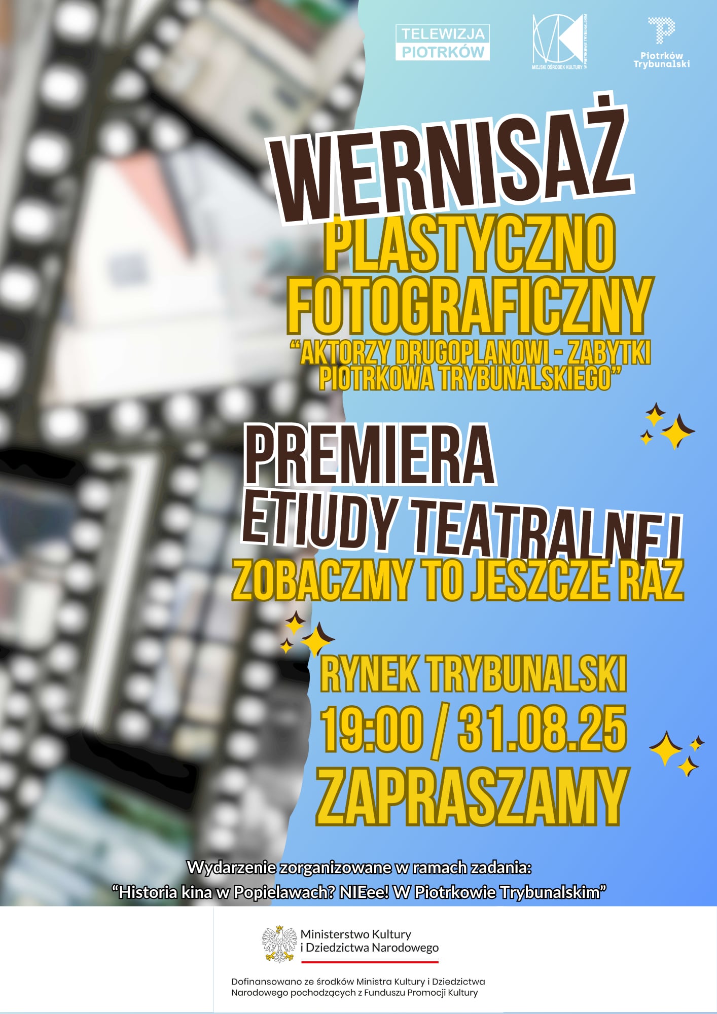 Kolejny klaps filmowego projektu „Historia kina w Popielawach? NIEee! W Piotrkowie Trybunalskim" już w najbliższą niedzielą 31 sierpnia. To będzie wydarzenie, które połączy historię, sztukę i teatr. Zapraszamy do Rynku Trybunalskiego na premierę etiudy teatralnej „Zobaczmy to jeszcze raz” w reżyserii Lucyny Jakubczyk oraz wernisaż wystawy plastyczno-fotograficznej „ Aktorzy drugoplanowi- zabytki Piotrkowa Trybunalskiego”.