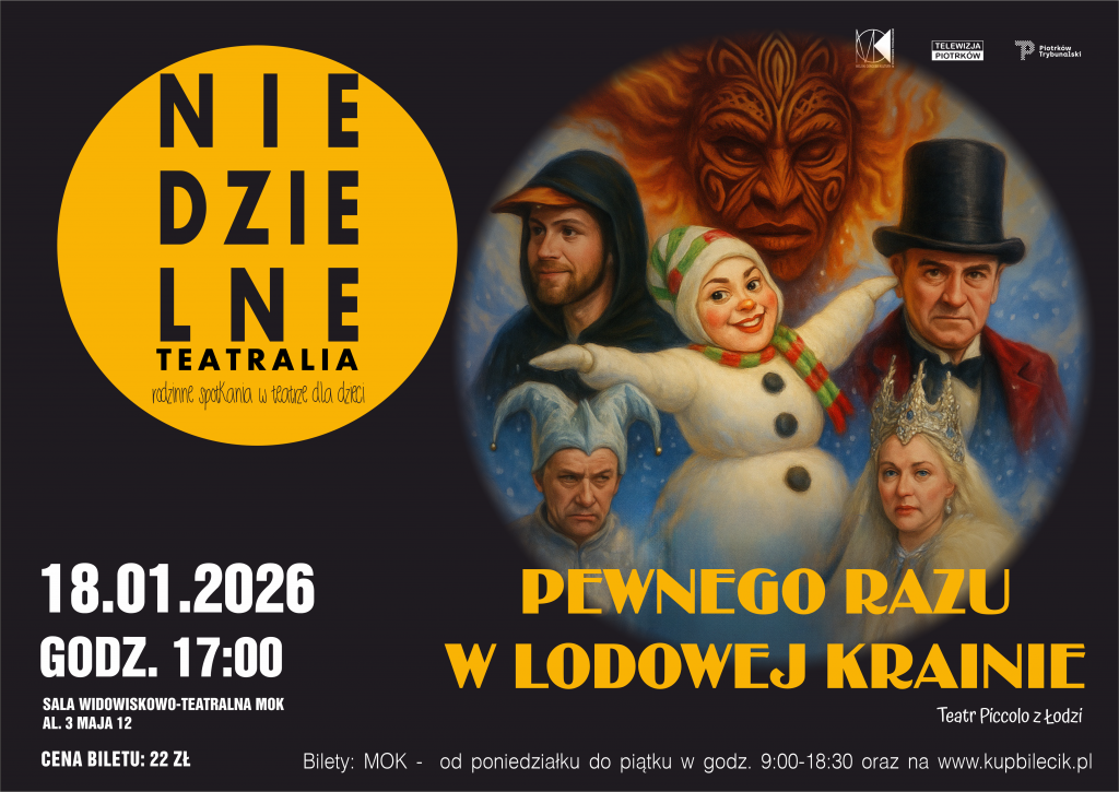 Już 18 stycznia 2026 roku zapraszamy najmłodszych widzów wraz z rodzinami na wyjątkowe spotkanie z teatrem! W ramach cyklu Niedzielne Teatralia na scenie MOK zaprezentowany zostanie spektakl dla dzieci pt. „Pewnego razu w Lodowej Krainie”. Bilety w sprzedaży.