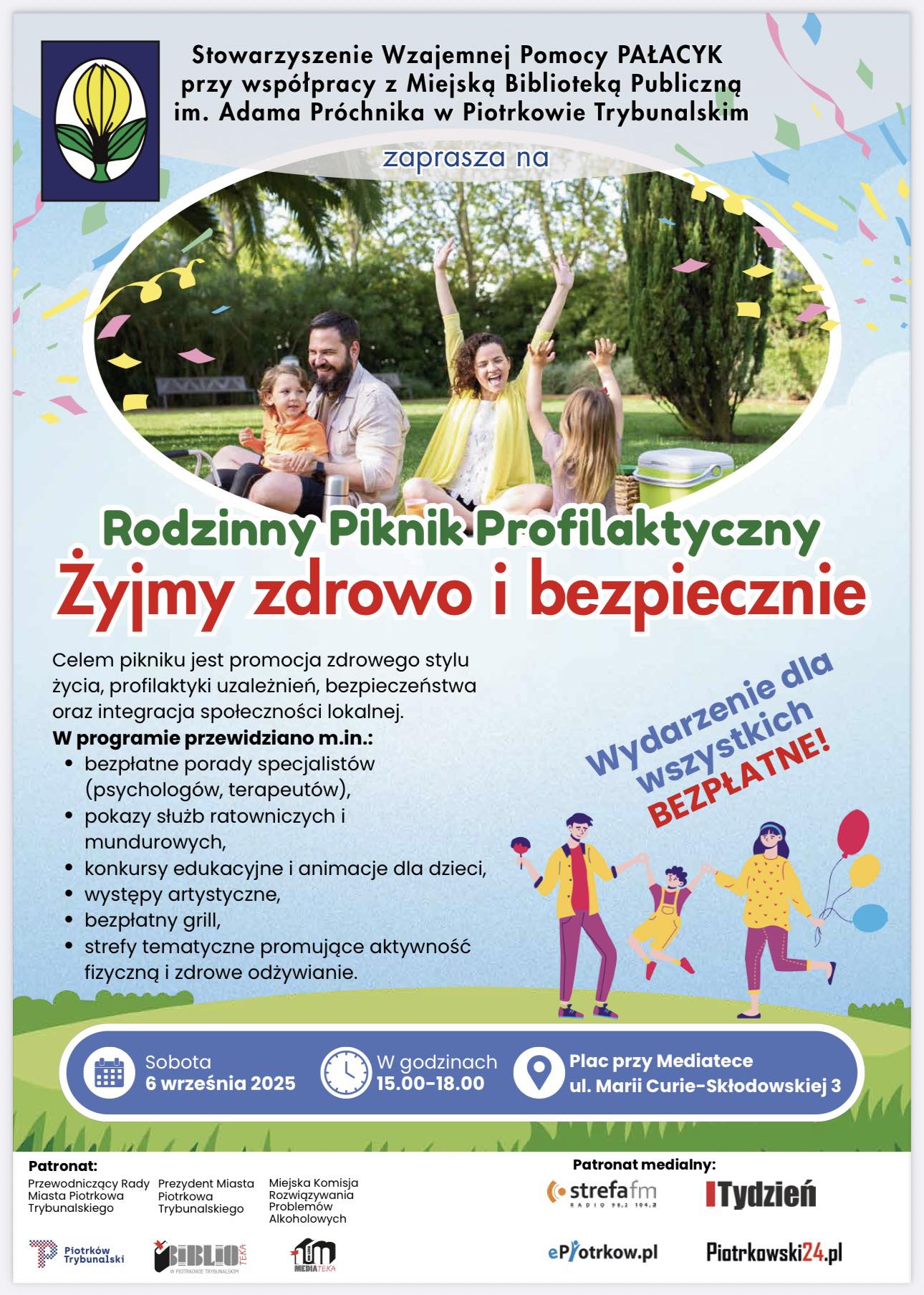 W sobotę, 6 września, w godz. 15-18 na placu przed Mediateką w Piotrkowie Trybunalskim odbędzie się piknik profilaktyczny – wydarzenie promujące zdrowy styl życia, bezpieczeństwo i integrację mieszkańców.