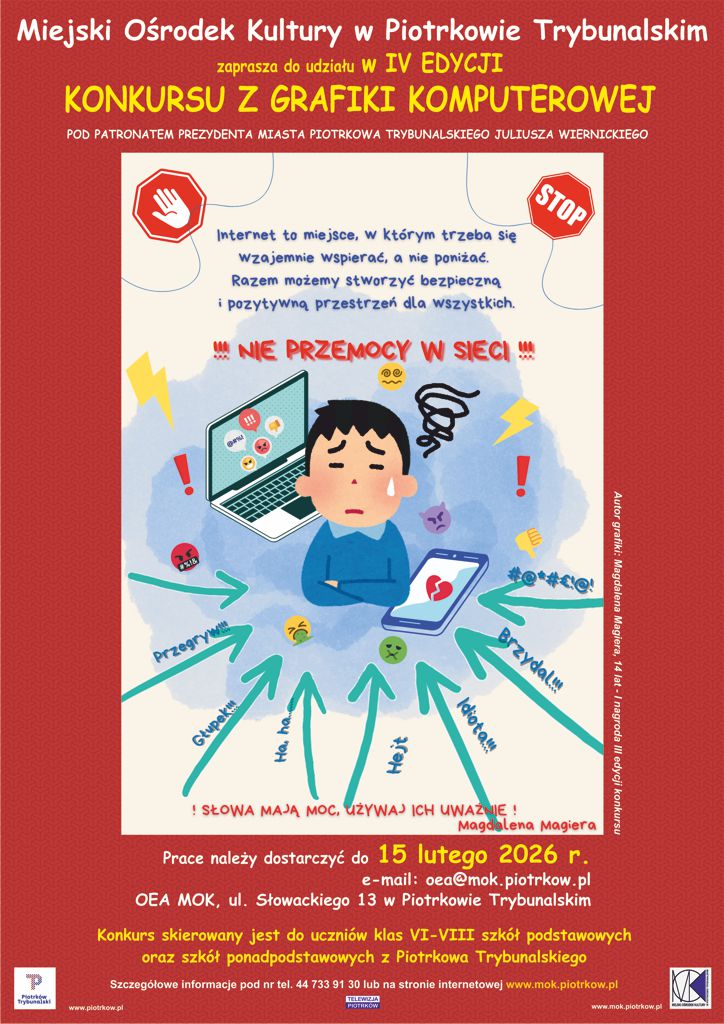 Uczestnicy tegorocznej edycji konkursu, stosując techniki komputerowe, będą mieli za zadanie wykonać projekt plakatu związany z tematem przewodnim, którym jest cyberprzemoc. Prace należy przesyłać drogą elektroniczną do 15 lutego 2026 r. na adres e-mail: oea@mok.piotrkow.pl