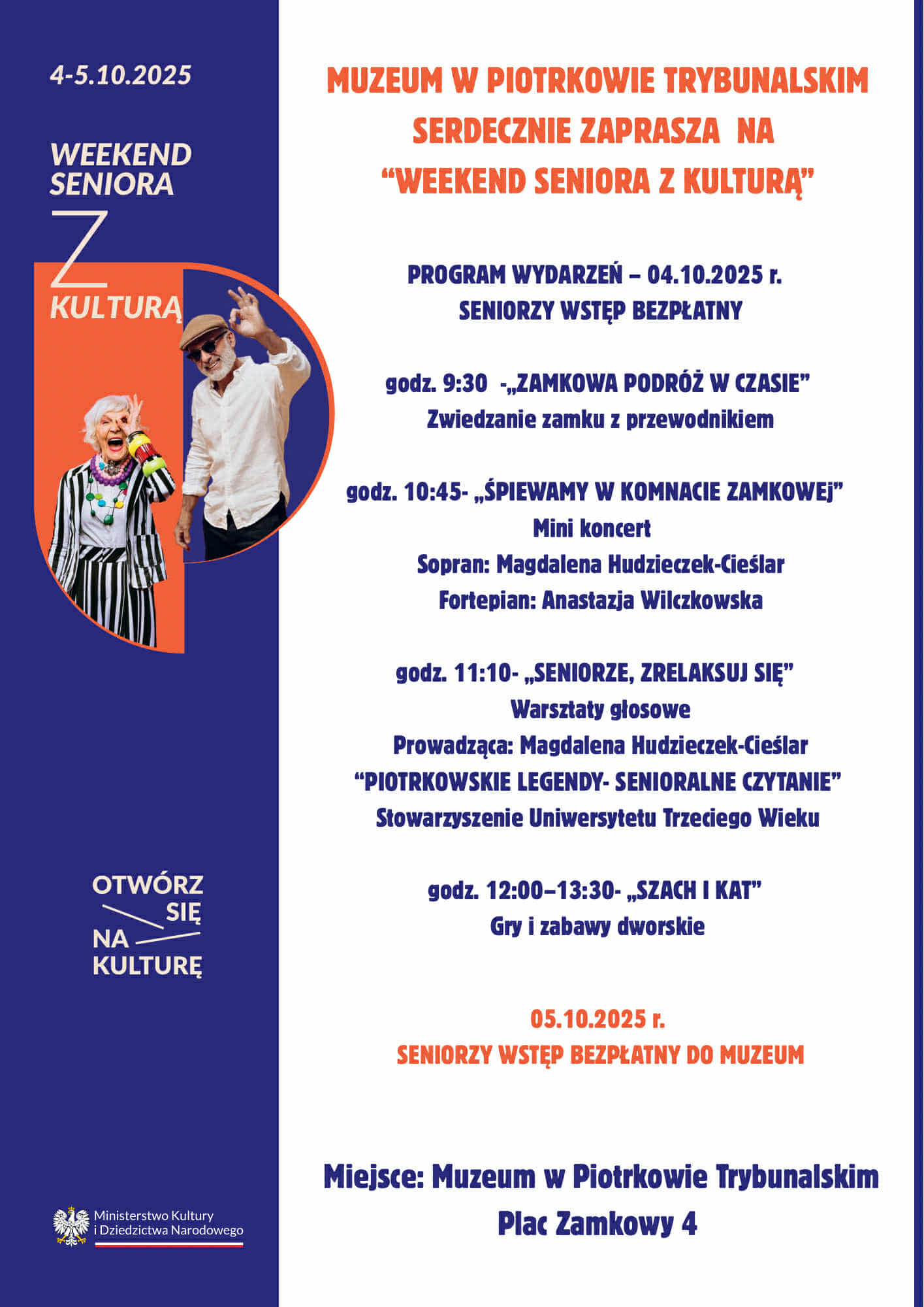 godz. 11:10 – „Seniorze, zrelaksuj się” – warsztaty głosowe i „Piotrkowskie legendy – senioralne czytanie”