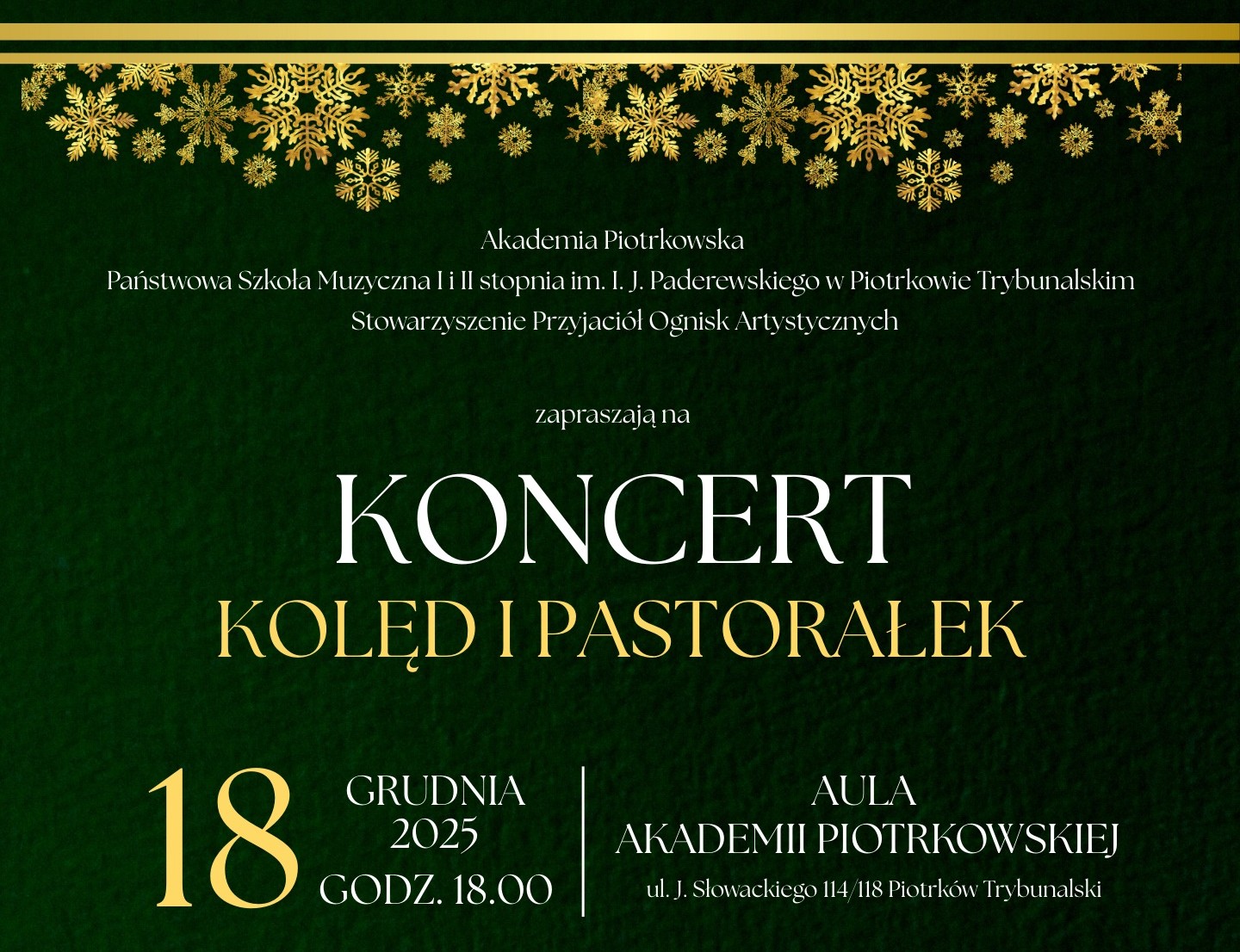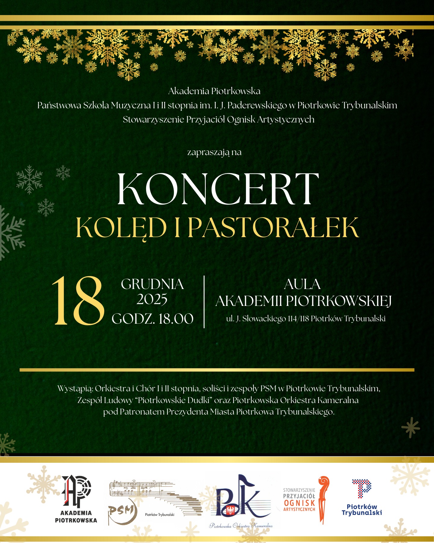Koncert kolęd i pastorałek odbędzie się w czwartek, 18 grudnia, w auli Akademii Piotrkowskiej. To będzie wieczór pełen muzyki, tradycji i świątecznego klimatu. Wystąpią orkiestry, chóry, soliści i zespoły Państwowej Szkoły Muzycznej I i II stopnia w Piotrkowie Trybunalskim, Zespół Ludowy „Piotrkowskie Dudki” oraz Piotrkowska Orkiestra Kameralna.