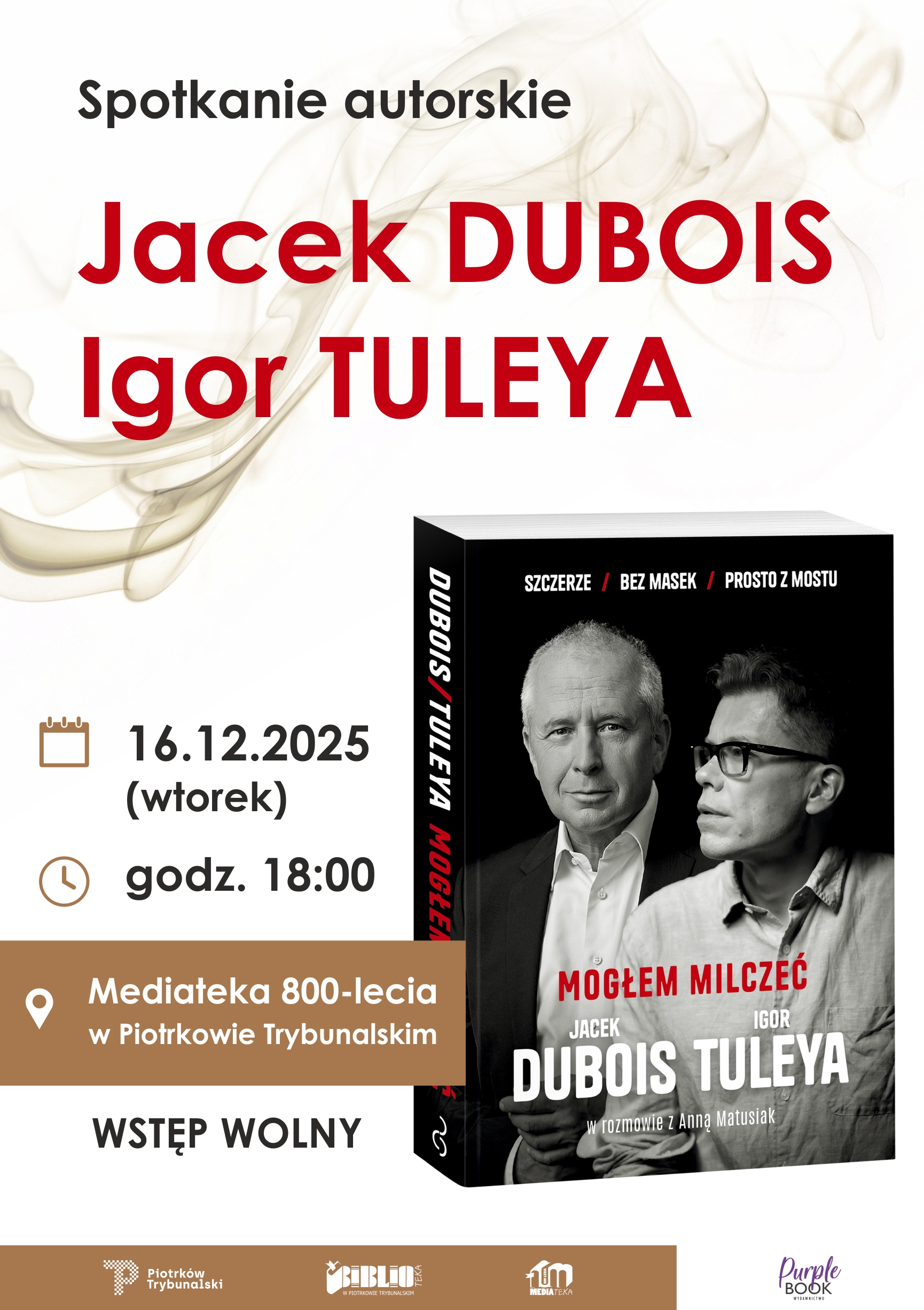W Mediatece odbędzie się spotkanie autorskie z Jackiem Dubois i Igorem Tuleyą, autorami książki „Mogłem milczeć”. Publikacja jest szczerym zapisem doświadczeń autorów i ich spojrzenia na pracę w wymiarze sprawiedliwości. Spotkanie poprowadzi Krzysztof Żołądek. Wstęp wolny.