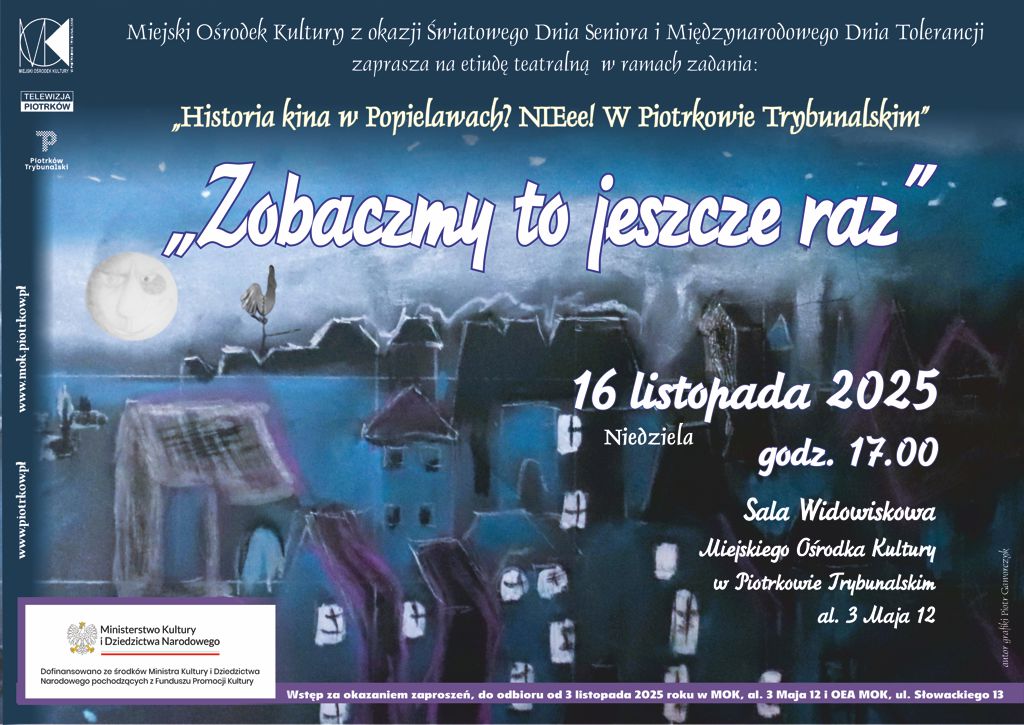 Miejski Ośrodek Kultury zaprasza na pokaz etiudy teatralnej pt. „Zobaczmy to jeszcze raz”, która powstała na podstawie filmu Tadeusza Chmielewskiego pt. „Ewa chce spać” z 1956 roku. Etiudę obejrzymy z okazji Światowego Dnia Seniora i Międzynarodowego Dnia Tolerancji, a towarzyszyć jej będzie finisaż wystawy plastycznej i fotograficznej pt. „Aktorzy drugoplanowi – zabytki Piotrkowa Trybunalskiego”.