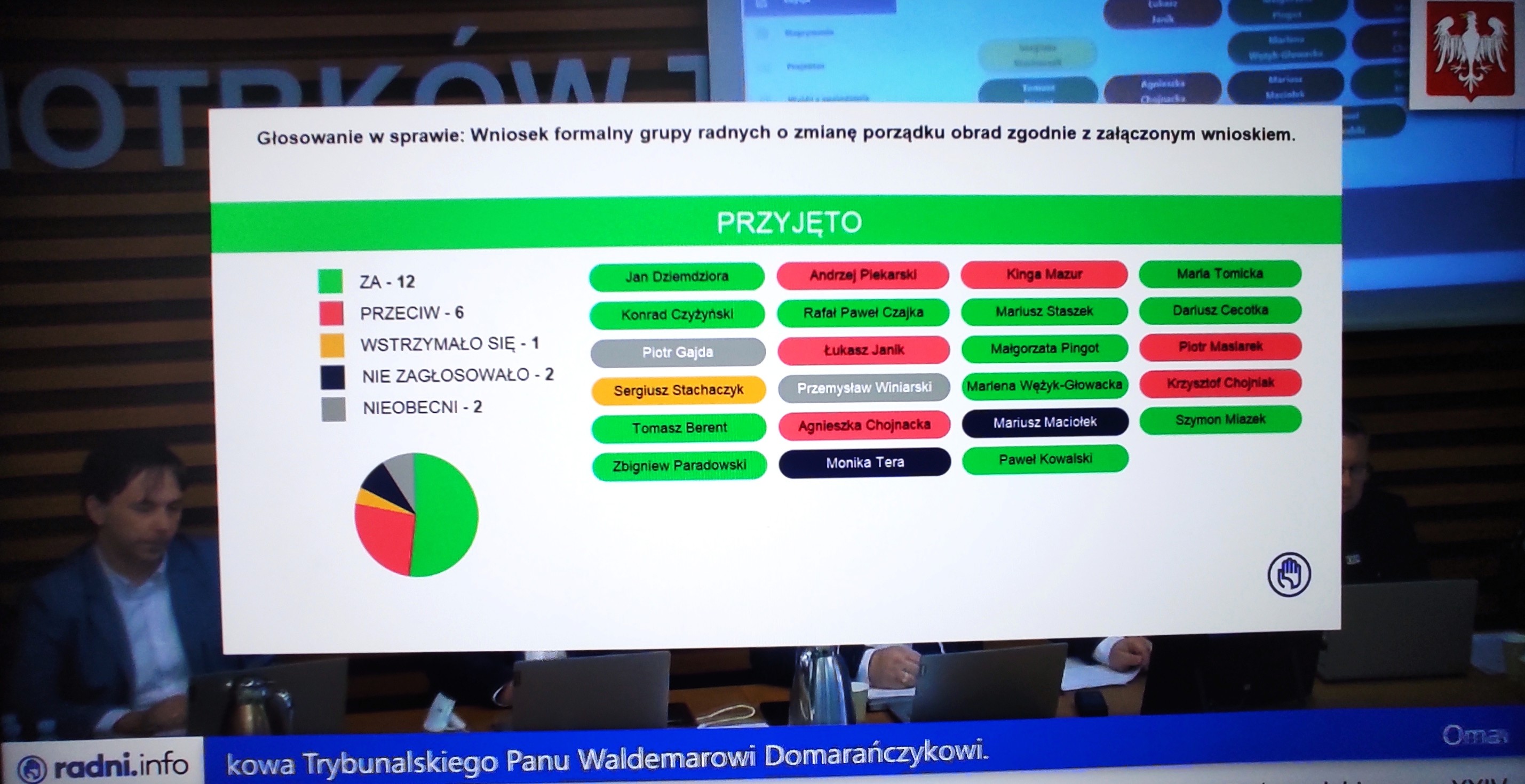Po kilkugodzinnej przerwie w obradach – na wniosek 11 radnych – zdecydowano o odwołaniu dwóch wiceprzewodniczących Rady Miasta: Mariusza Maciołka i Andrzeja Piekarskiego. Radni podjęli też decyzje w sprawie powołania nowych wiceprzewodniczących i nowych przewodniczących miejskich komisji.