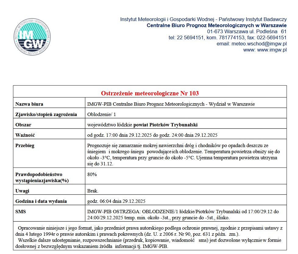 IMGW wydał kolejne ostrzeżenie 1. stopnia przed marznącymi opadami i oblodzeniem dla Piotrkowa Trybunalskiego i regionu. Ostrzeżenie obowiązuje od godzin popołudniowych w poniedziałek, 29 grudnia.