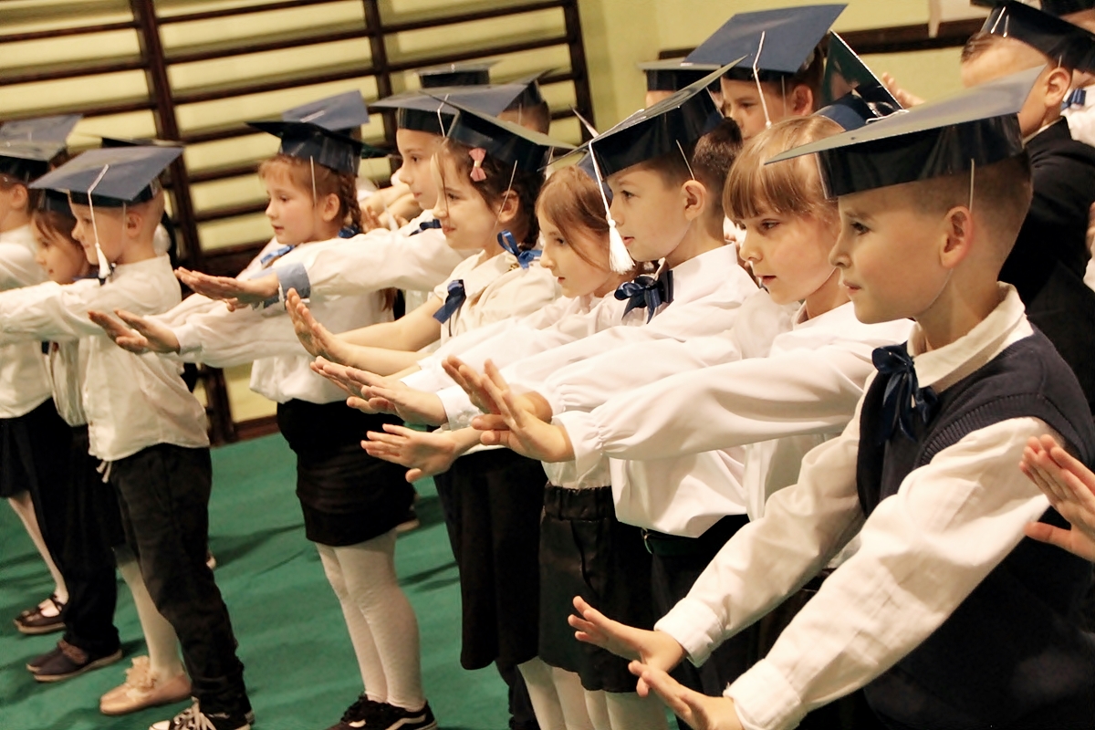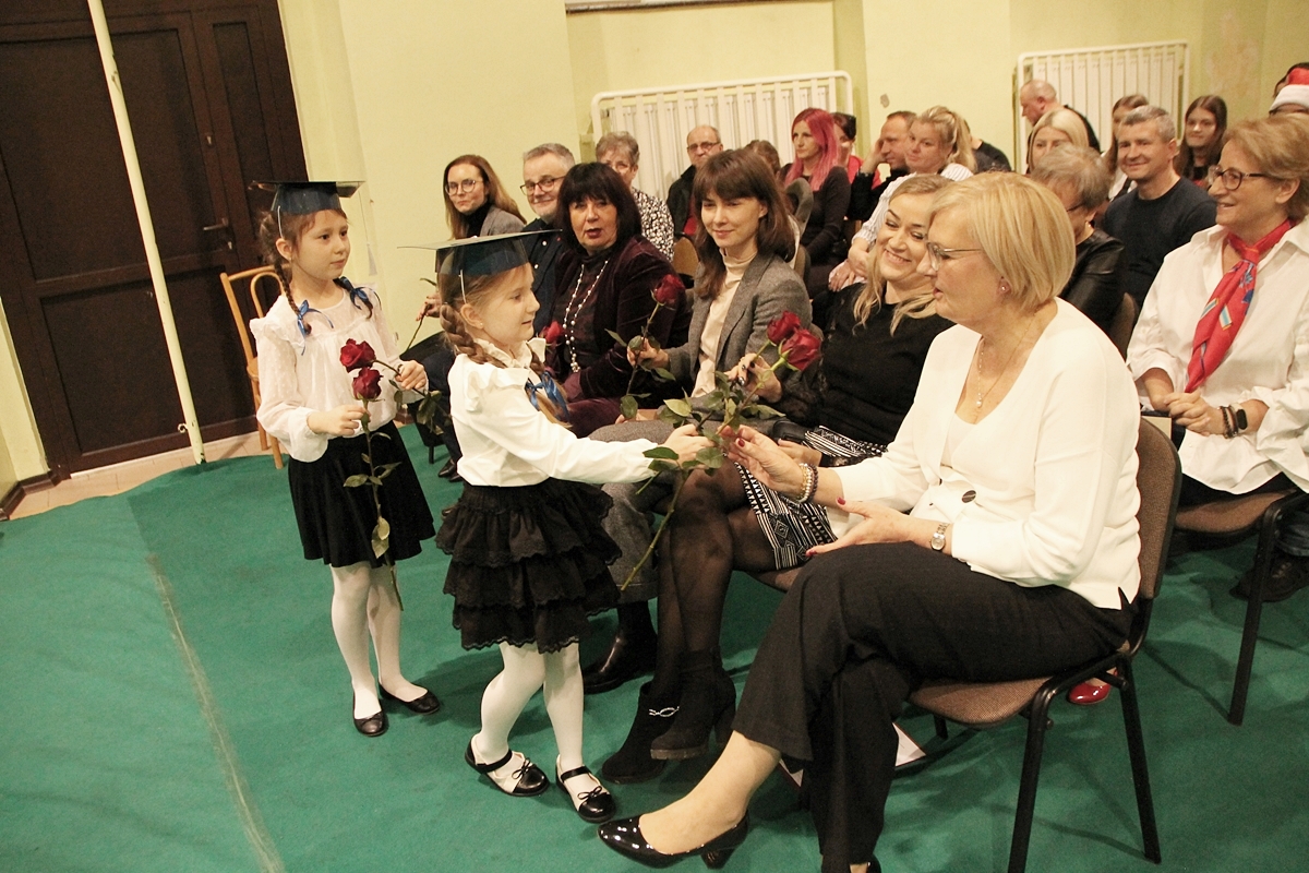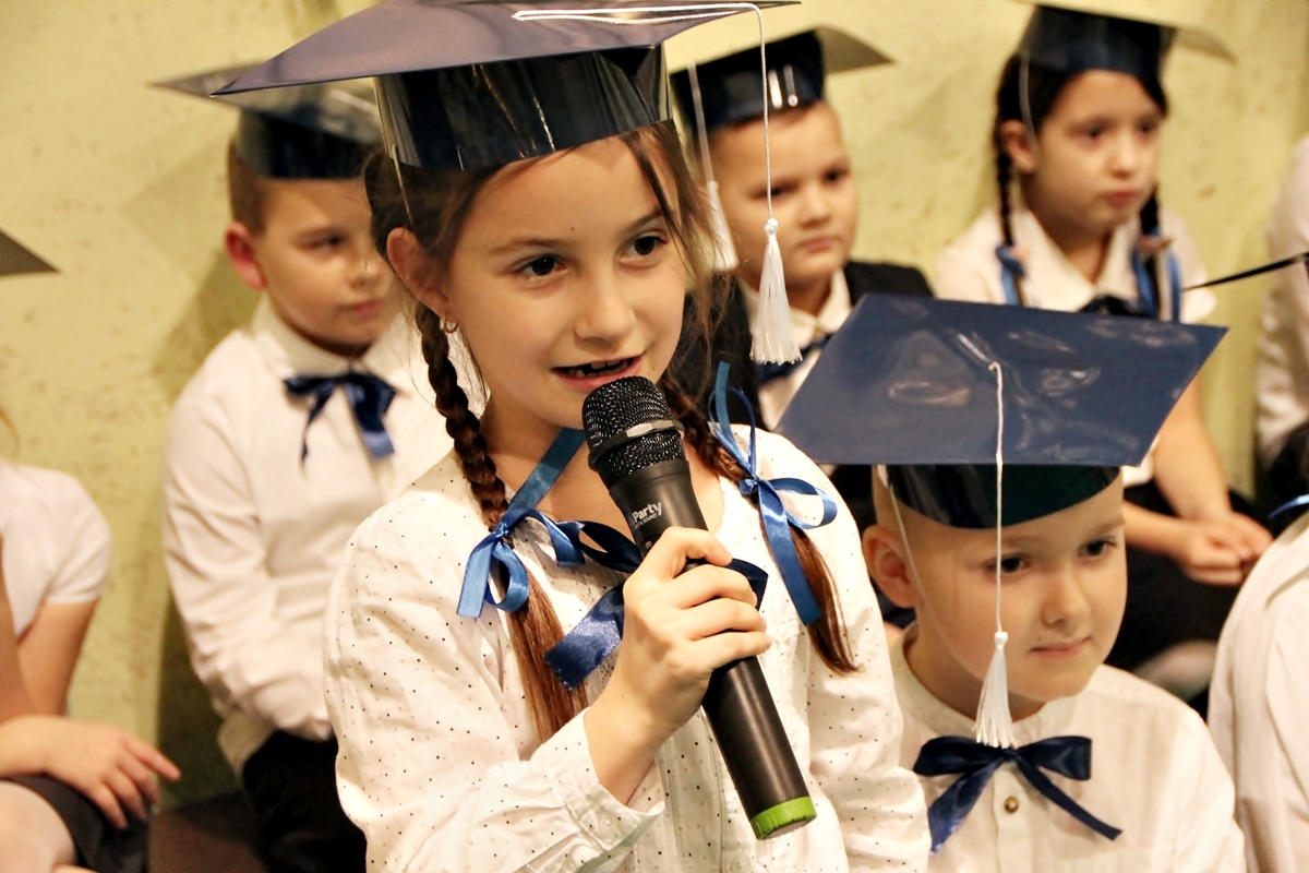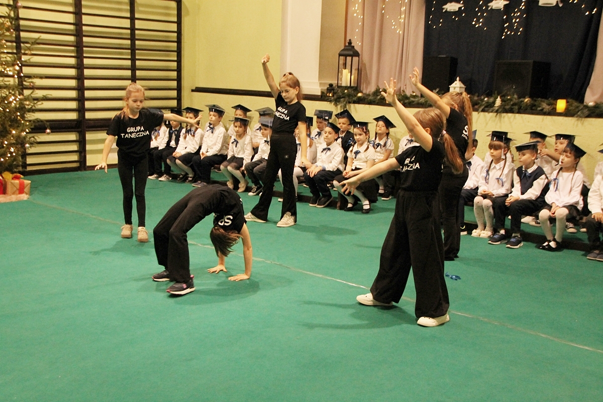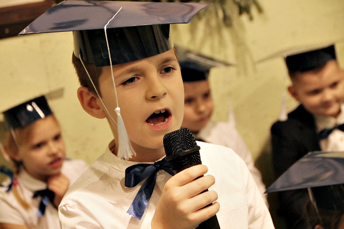 Najważniejsze jednak tego dnia były dzieciaki z dwóch klas pierwszych, które pod czujnym okiem swoich wychowawczyń, jeszcze przed ślubowaniem i pasowaniem, musiały się wykazać wiedzą i umiejętnościami „sprawdzanymi” przez prowadzące całą uroczystość uczennice klas ósmych. Pierwszaki popisywały się też swoimi wokalnymi umiejętnościami, a czas zebranym umilały występy szkolnej grupy tanecznej.