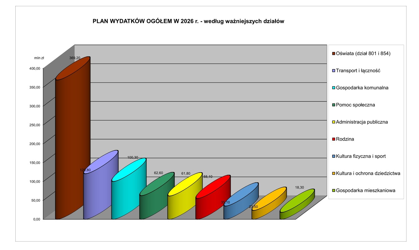 Największą część wydatków pochłonie oświata – ponad 369 mln zł. Prawie 121 mln zł miasto wyda na transport i łączność, ponad 100 mln zł na gospodarkę komunalną. Ponad 62,6 mnl zł miasto przeznaczyło w 2026 roku na pomoc społeczną, natomiast ponad 18 mln zł na gospodarkę mieszkaniową. Na 93 projekty inwestycyjne zaplanowano ponad 161 mln zł.