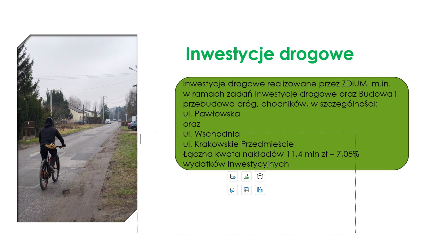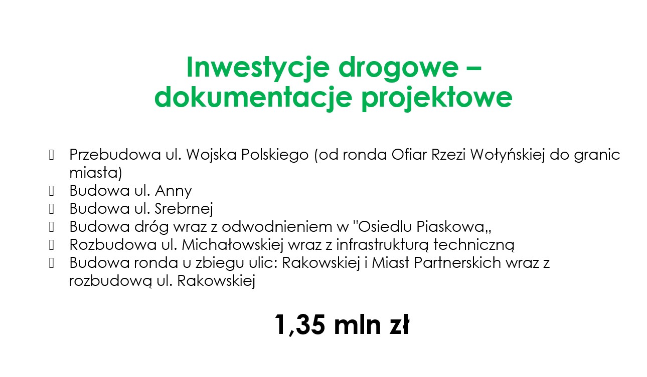 Budowa wielu ulic, m.in. Żelaznej, Pawłowskiej, Wschodniej czy Krakowskiego Przedmieścia, nowe autobusy elektryczne, budowa lodowiska miejskiego, nowe boiska przy miejskich szkołach, modernizacja terenów wokół Słoneczka i zbiornika Bugaj, modernizacja hali Relax i OSiR przy Belzackiej, rewitalizacja starego miasta – czyli modernizacja kolejnych czterech kamienic i budowa nowej czy całkowita wymiana miejskiego oświetlenia – a to tylko część inwestycji wpisanych do projektu budżetu na 2026 rok.