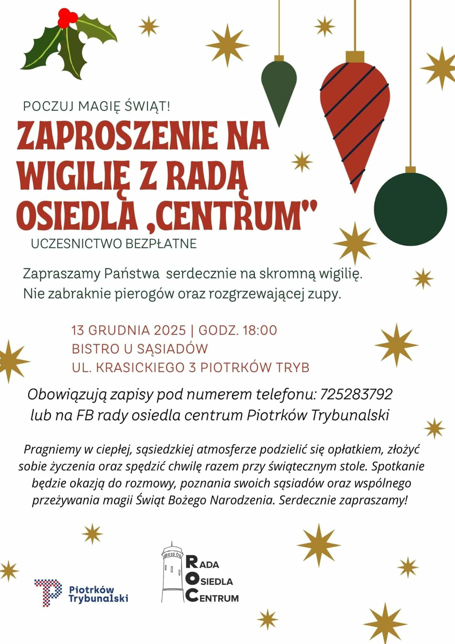 Tego samego dnia swoje spotkanie organizuje również Rada Osiedla „Centrum”. Wigilia odbędzie się 13 grudnia 2025 r. o godz. 18:00 w Bistro u Sąsiadów, przy ul. Krasickiego 3. Organizatorzy zapowiadają świąteczne dania, w tym pierogi i rozgrzewającą zupę. Udział jest bezpłatny, jednak obowiązują wcześniejsze zapisy telefoniczne lub poprzez profil rady na Facebooku.