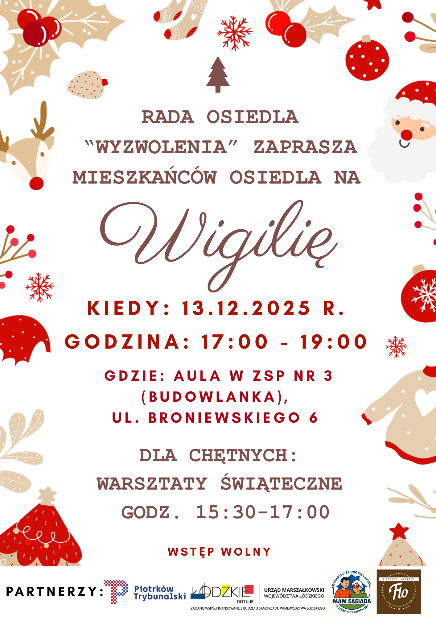 Rada Osiedla „Wyzwolenia” zaprasza mieszkańców na wspólną Wigilię, która odbędzie się 13 grudnia 2025 r. w godzinach 17:00–19:00 w auli ZSP nr 3 (Budowlanka), ul. Broniewskiego 6. Dodatkową atrakcją będą warsztaty świąteczne, zaplanowane na godz. 15:30–17:00. Wstęp na wydarzenie jest wolny.