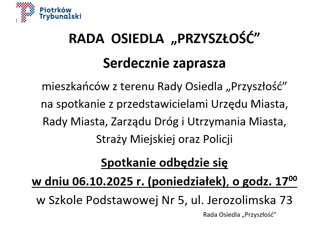 Kolejne spotkanie dla mieszkańców tym razem organizuje Rada Osiedla Przyszłość. To okazja, by spotkać się z przedstawicielami Urzędu Miasta, Rady Miasta, Zarządu Dróg i Utrzymania Miasta oraz pracownikami Straży Miejskiej i piotrkowskiej komendy policji.