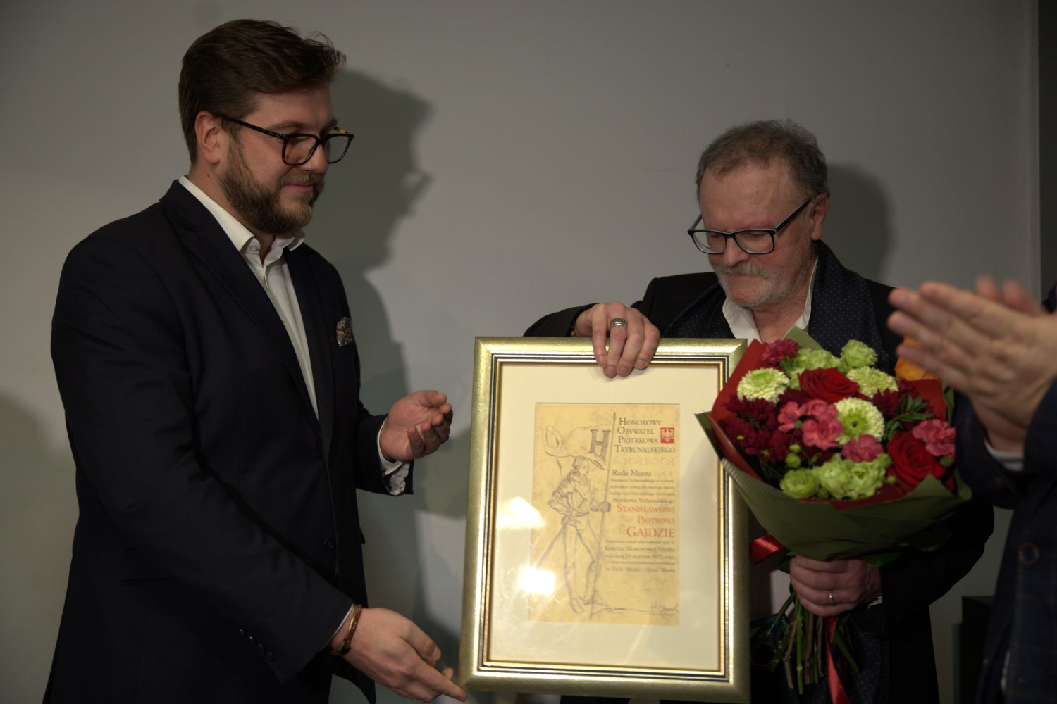W Ośrodku Działań Artystycznych przy ul. Dąbrowskiego – miejscu, które Stanisław Piotr Gajda tworzył przez wiele lat – odbyło się uroczyste wręczenie mu tytułu Honorowego Obywatela Miasta Piotrkowa Trybunalskiego. Akt nadania wręczyli prezydent Juliusz Wiernicki, Mariusz Staszek, przewodniczący Rady Miasta, i jej wiceprzewodnicząca, Małgorzata Pingot.