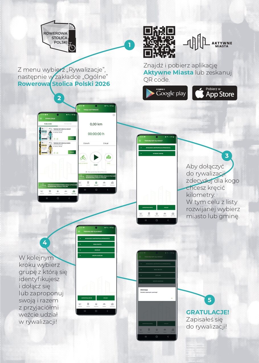 Oficjalny trening potrwa do 21 maja, a już 1 czerwca rozpocznie się 8. edycja rywalizacji o Puchar Rowerowej Stolicy Polski. Organizatorzy podkreślają, że podczas treningu przejechane kilometry są sumowane dla wybranego miasta albo gminy. W głównej rywalizacji punkty będą już przeliczane na podstawie liczby mieszkańców, więc liczyć się będzie nie tylko liczba kilometrów, ale też mobilizacja całej lokalnej społeczności.W załącznikach ulotka z instrukcją obsługi aplikacji, regulamin konkursu oraz Kod QR. Koordynatorem akcji w Piotrkowie jest inżynier miasta, Adam Bak. Kontakt: a.bak@piotrkow.pl lub pod numerem telefonu 44 732-76-98.